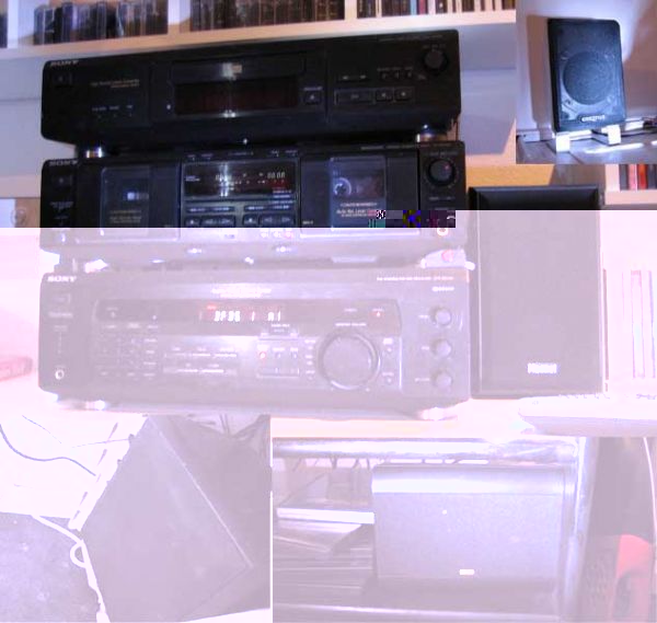 Von den Boxen ist nur noch die Centerbox, ("Jamo 30", 2-Wege, 50W, 8 Ohm, im Bild unten rechts) in Betrieb. Als Hauptboxen hab ich seit einem Jahr Magnat ("Monitor 110", 2-Wege, 50W, 4-8 Ohm, rechts neben der Anlage), 2 Creative Rearboxen und seit 2 Jahren einen Aktiv-Woofer vom blauen C, (120W, im Bild unten links, er steht unter der Anlage). Der Woofer ist nur zu ca 20% aufgedreht, das reicht dicke hin. Wenn ich ihn voll aufdrehe, hören das die Nachbarn 2 Etagen tiefer noch...