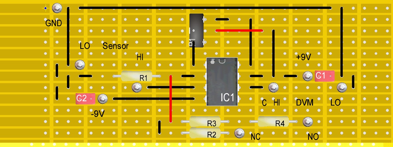 Die Schaltung lässt sich am einfachsten auf einer Punkt-Streifenrasterplatine aufbauen: Die beiden rot eingezeichneten Brücken müssen isoliert ausgeführt werden. Eine geätzte bzw. gefräste Platine wäre zwar kompakter und schöner, bei den paar Bauteilen lohnt sich der Aufwand aber nicht.