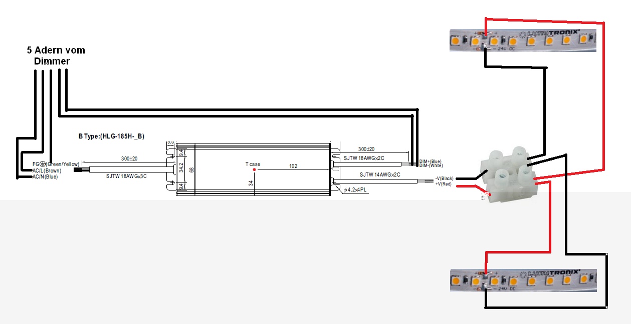 Am HLG-185H-24B sind schon Kabel (30cm Länge) angebracht. Vom LED-Ausgangskabel zu einer Lüsterklemme oder Wago-Klemme und von dort zu den beiden Seiten mit den LED-Leisten.