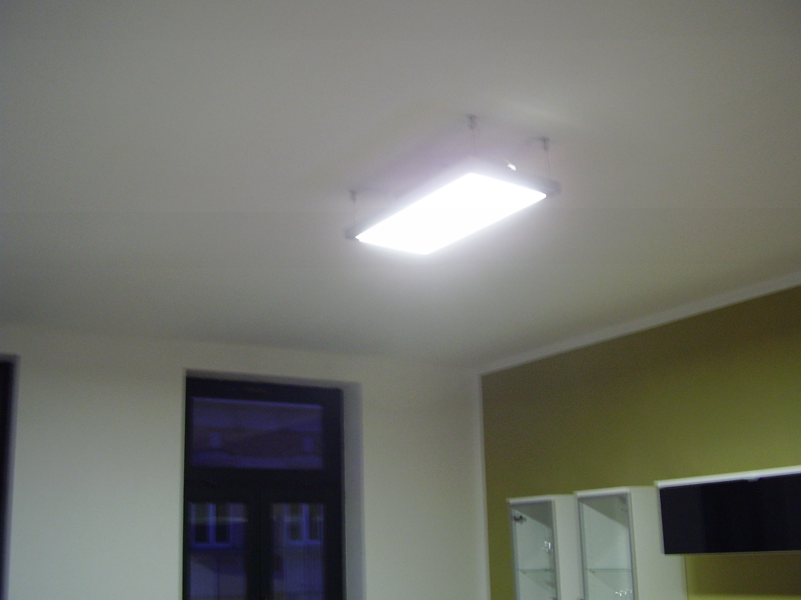 Hier wie versprochen das Bild vom LED Panel. Habe es mit 4 Stahlseilen abegehängt, das Netztteil mit dem Dimmer liegt einfach auf dem Panel.