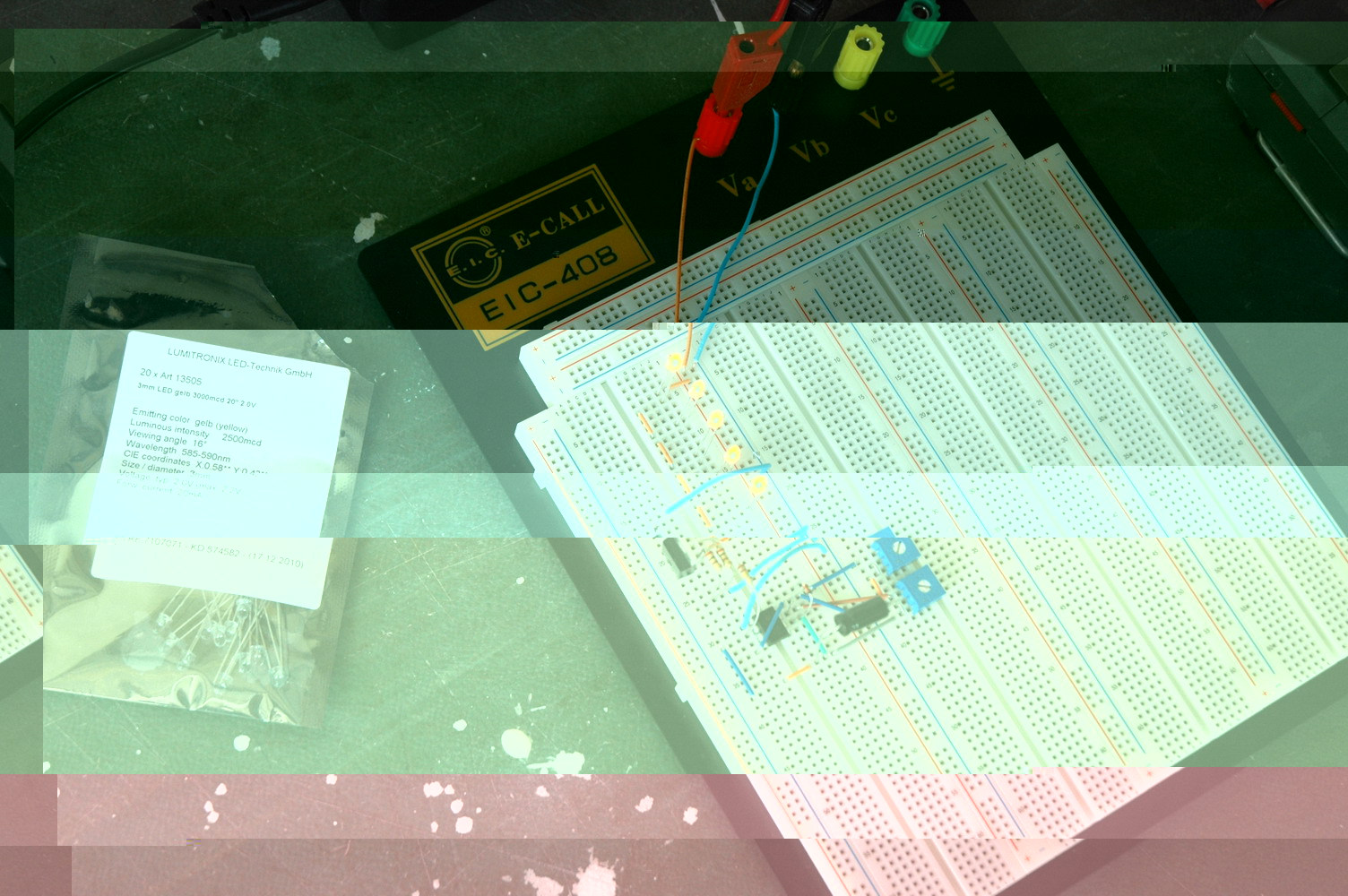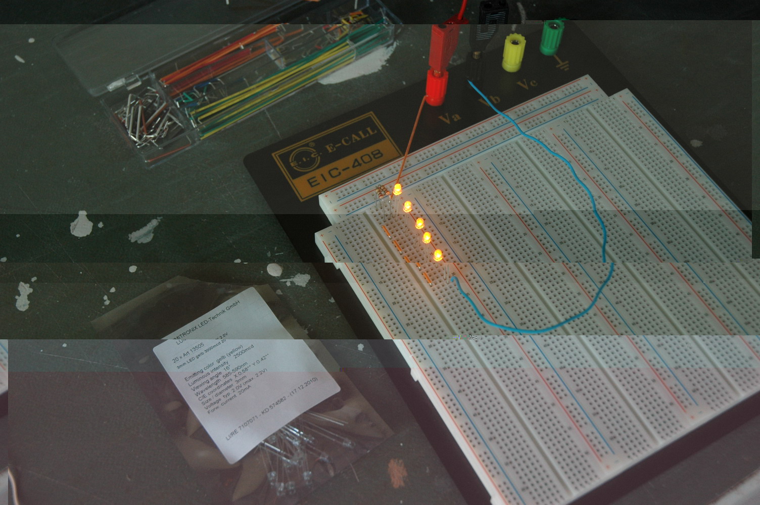 Das war doch nur ein Test, ob die Kontakte des Steckboards halbwegs was taugen... Außerdem ist es auch hier durchaus interessant, weil ja die Toleranzen bei der LED Flussspannung auch recht groß ausfallen können.