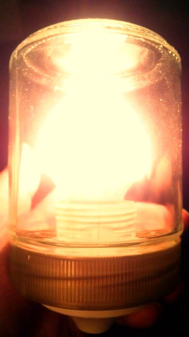 Mein Handy hat da allerdings ein gruseliges türkis-lila und irgendwas dazwischen draus gemacht. Ich habe die Farben des Bildes rumgebogen. Näher kriege ich es an die Realität nicht dran (Die Leuchtkugel aus der Birne zählt, der Rest drumrum ist trotzdem noch arg verfälscht, weil ich noch anderes Licht zuschalten musste fürs Foto). :mrgreen: