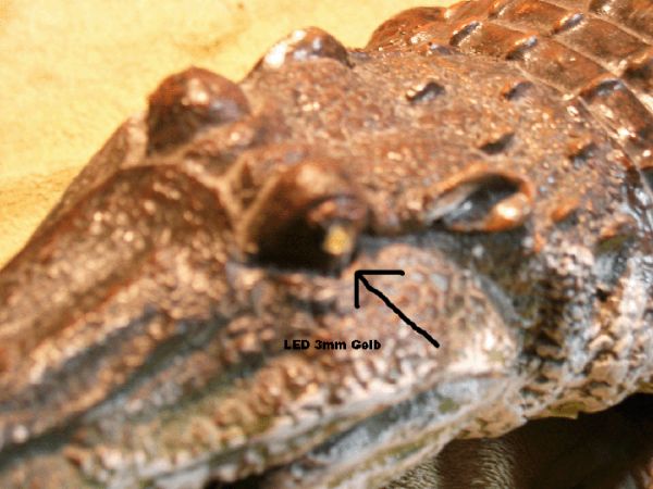 Zuerst habe ich je ein 3mm Loch in den Augen und Maul des Kroko gebohrt.