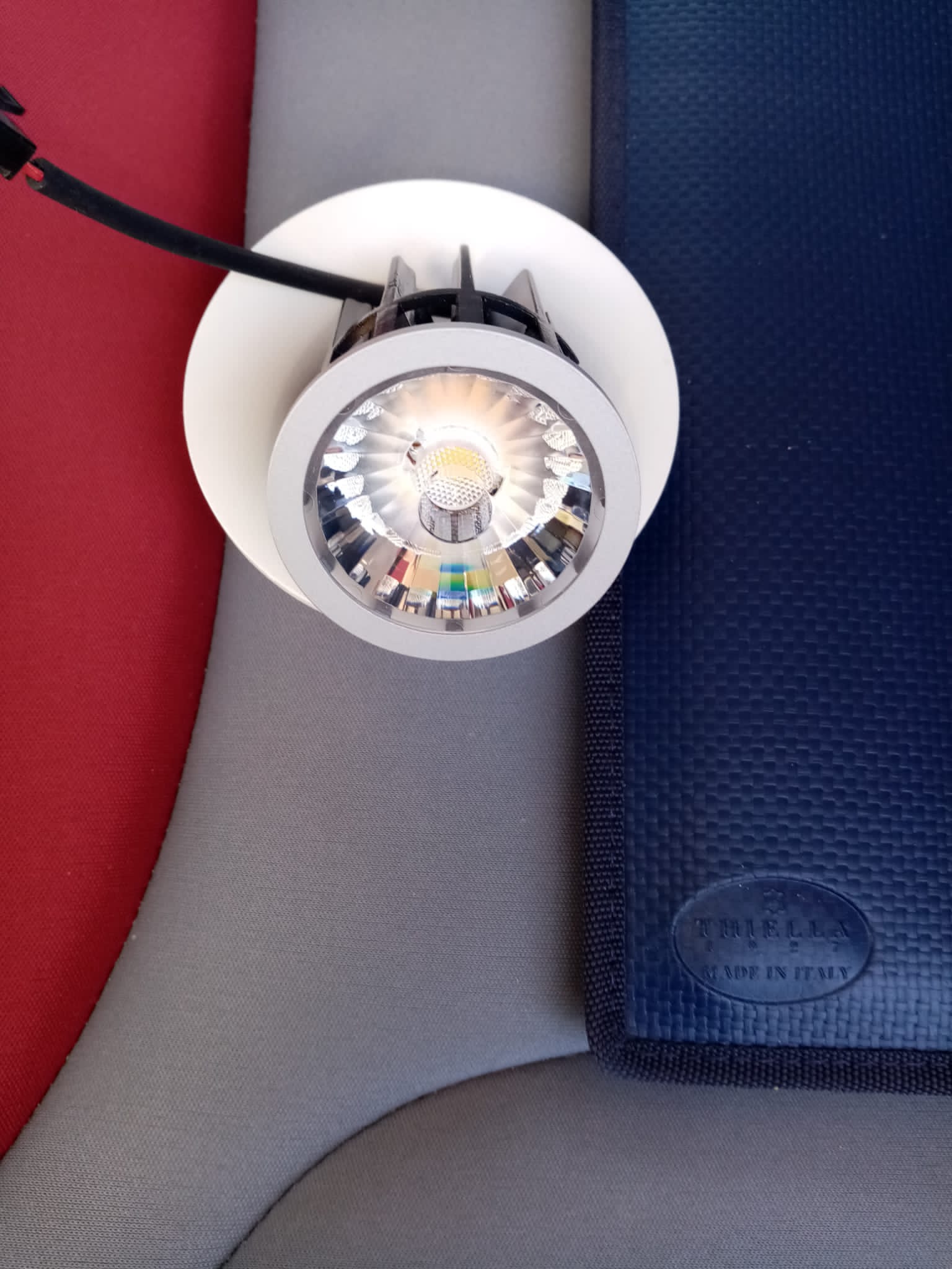 Wir haben einen Deckenlampe, die 5flammig ist und 3 LED-Einbauspots hat.