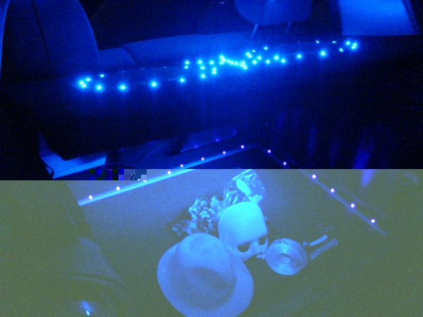 50 x 3mm blaue leds im linken fußraum und im kabelkanal.
