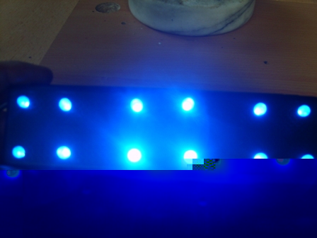 Ich habe einfach eine blaue SMD-Leiste genommen. Diese habe ich mit einem Netzteil verlötet, wobei das Netzteil in der Spannung zwischen 3V und 12V einstellbar ist. Die Leiste habe ich dann mit zwei Tropfen Silikon am Aquariendeckel befestigt und trocknen lassen.
