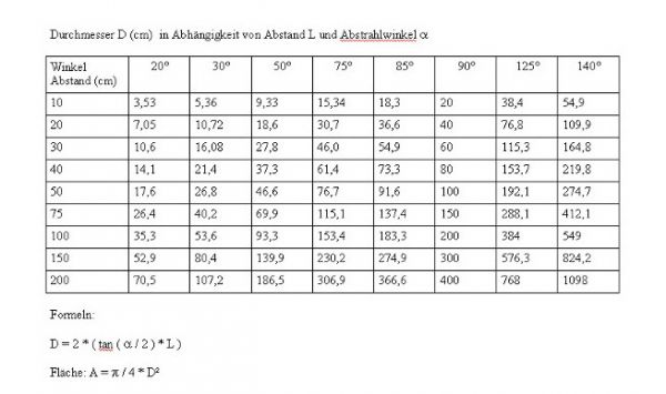 Aber danke für deine Bemühung bios-service! Bisher habe ich die beleuchtete Fläche für meine Projekte immer einzeln ausgerechnet und musste öfters mal meine Formelsammlung rauskramen, weil man sich shcließlich nicht alle Formeln merken kann. Jetzt hat man alles (zumindest die wichtigsten Abstände und Winkel) auf einen Blick, danke :)