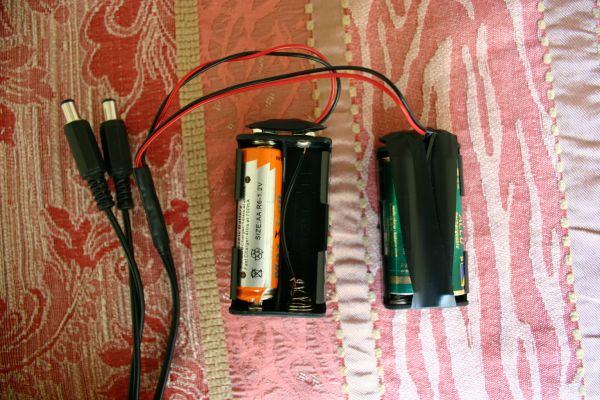 Die Stromversorgung ist denkbar simpel. Links Der Viererpack mit 3 Akkus.