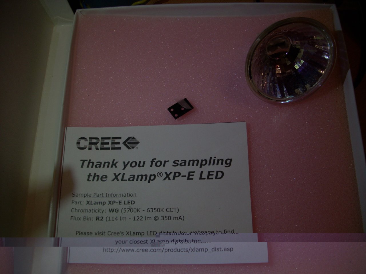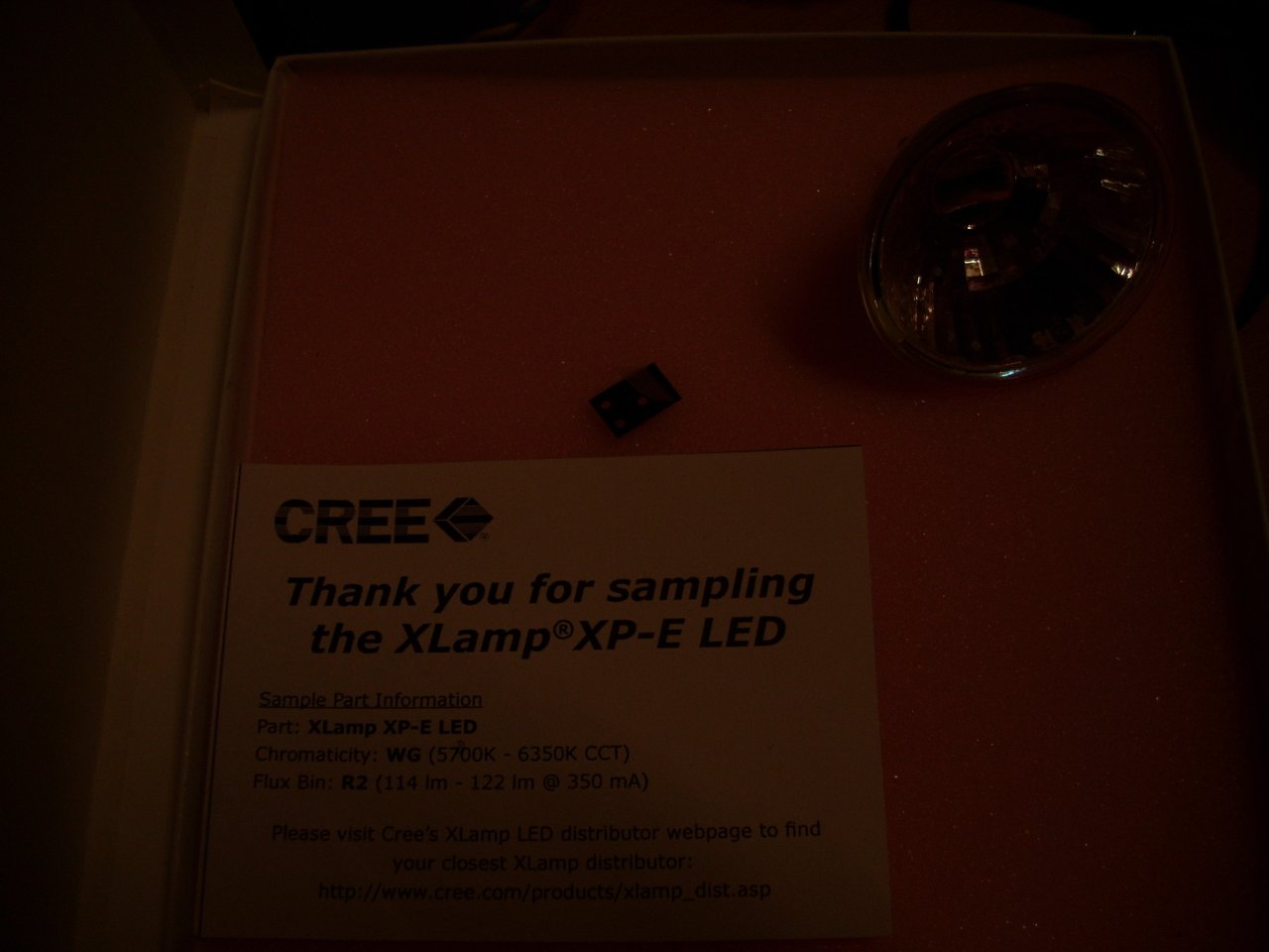 Ich habe die Cree XLamp XP-E R2 in kaltweiß (gibt's hier im Shop noch gar nicht, hab' sie mir als sample bestellt), die hat 114 bis 120 Lumen @ 350 mA (1,00 Watt).