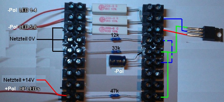 Wichtig: Der Mosfet braucht einen Kühlkörper! Und natürlich auch die LEDs. Also nicht einschalten bevor die montiert sind...