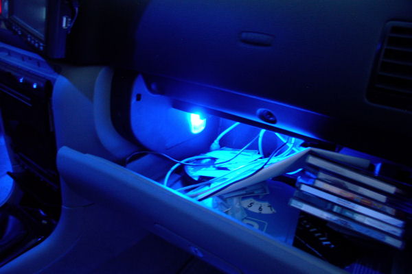 Fußraumbeleuchtung mit 20 x Superflux: Handschuhfach mit 6 x Superflux: Endstufenbeleuchtung mit einer pulsierenden 1Watt Luxeon: Kofferraumbeleuchtung mit 10 x Superflux: Türgriffmulde mit je einer 5mm LED: Weitere Umbauten vielleicht nächste Woche.