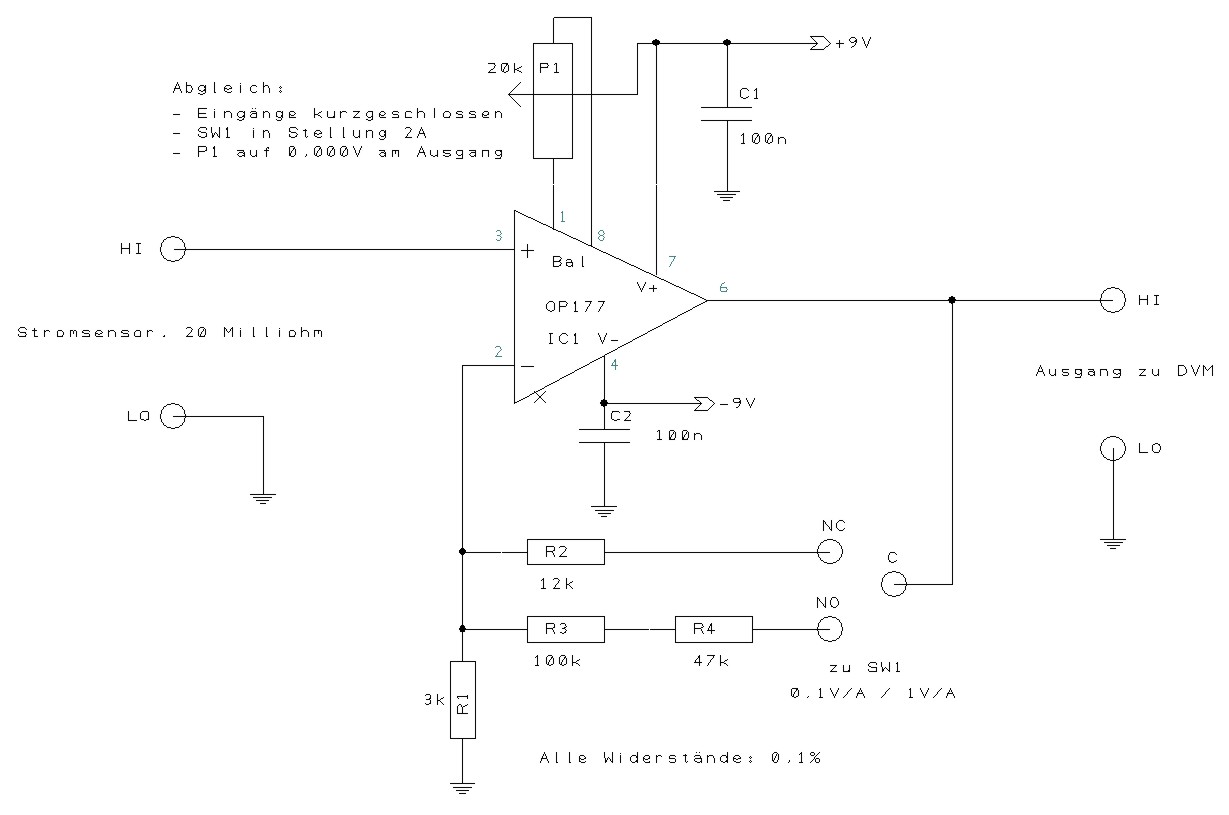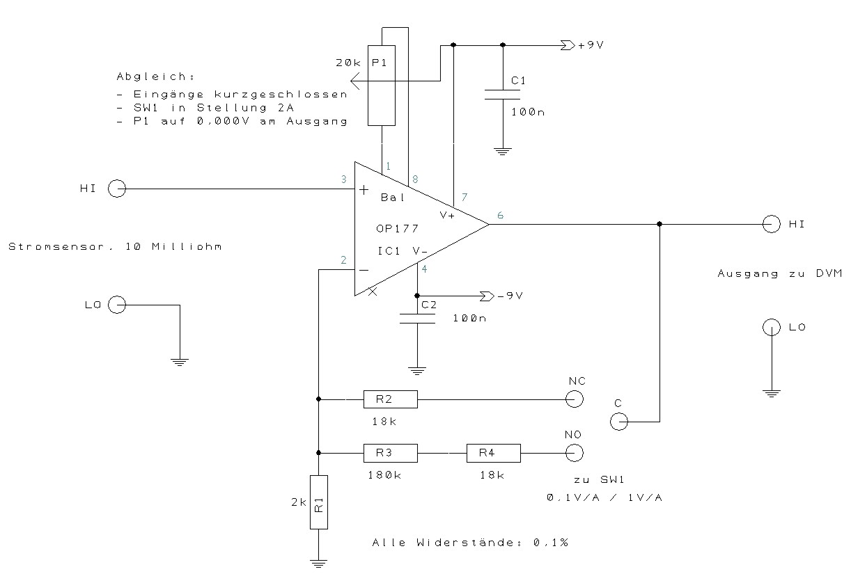 Der resultierende sehr geringe Spannungsabfall von nur 20 mV/A über dem Messwiderstand wird durch eine einfache aktive Schaltung auf einen vernünftig messbaren Spannungswert verstärkt. Schaltungstechnisch verwende ich einen Präzisions-OP-Amp als nichtinvertierenden Verstärker. Die Schaltung arbeitet damit als Strom-Spannungs-Wandler. Der Verstärkungsfaktor ist zwischen 5 und 50 umschaltbar. Daraus ergeben sich 2 Ausgangsbereiche: