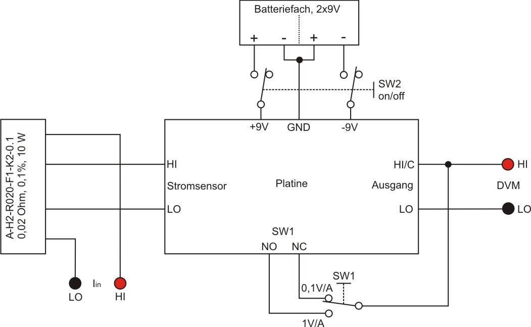 Um mit dem Gerät Strom zu messen, werden die Anschlüsse Iin-HI und Iin-LO zwischen Stromquelle und Verbraucher geschaltet (also wie ein normales Amperemeter). An den Anschlüssen DVM-HI und DVM-LO wird ein Multimeter in Stellung DC-V angeschlossen. Der zu wählende Messbereich hängt vom jeweiligen Multimeter und dem zu messenden Strom ab.